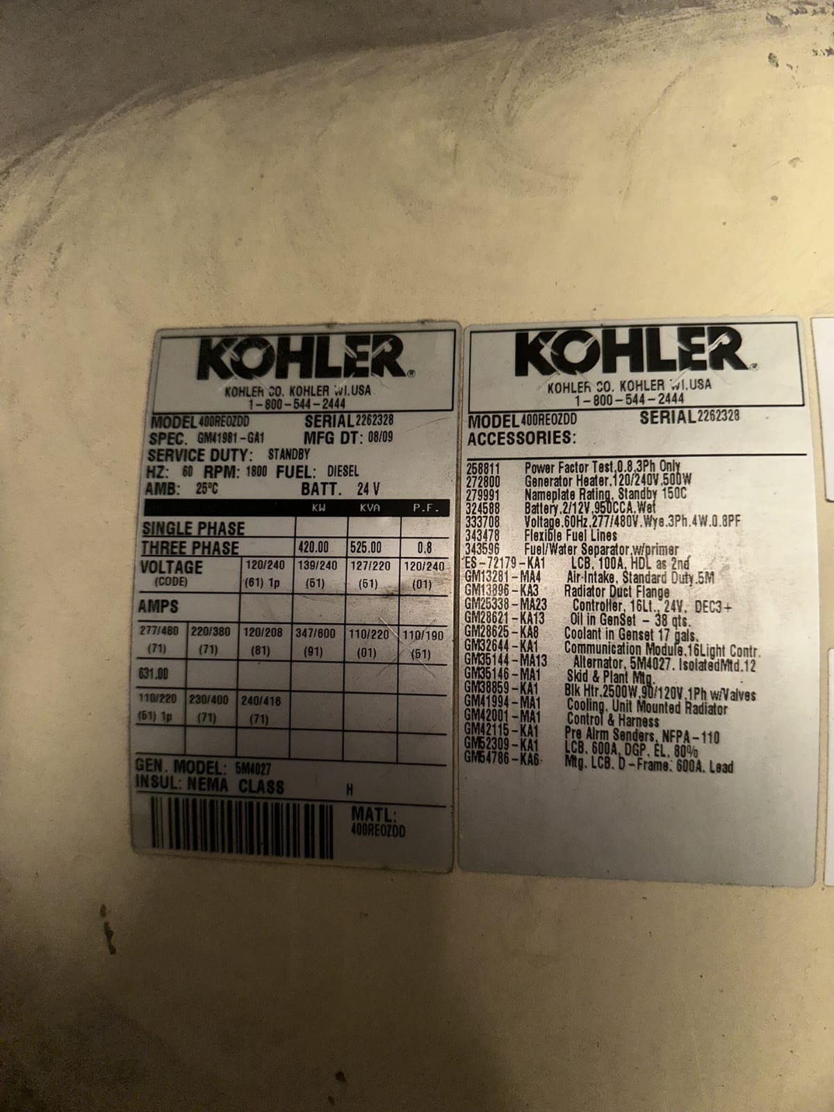 Planta de luz o generador marca Kohler 525 kva 420 kw modelo 400REOZDD